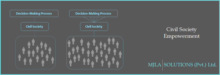 Civil society organizations collaborate and coordinate with the public and private sector on the basis of inclusion, capability, equality and trust. By engaging both in governance and implementation, they can help raise oversight and accountability, create ownership of stakeholder communities and can increase the delivery capacity of service delivery providers if built into implementation systems.